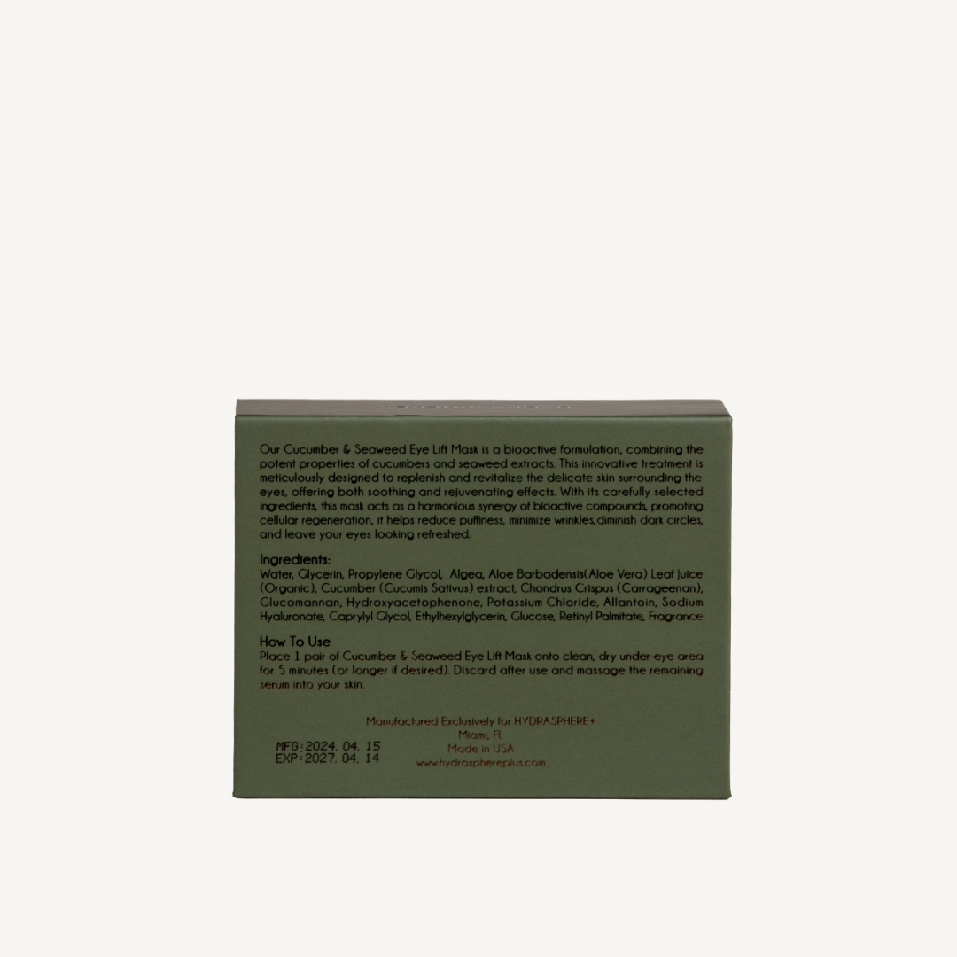 Nuestra fórmula Cucumber & Seaweed Eye Lift está cuidadosamente elaborada con una combinación de ingredientes nutritivos, concretamente Pepino y Extracto de Algas Marinas, para proporcionar a su piel la nutrición que necesita. Juntos, estos ingredientes cuidadosamente seleccionados trabajan en armonía para proporcionar una solución integral para hacer frente a problemas comunes tales como líneas finas, arrugas, hinchazón y ojeras. Si desea combatir los signos del envejecimiento o simplemente mimar sus ojos con un tratamiento de lujo, nuestro lifting de ojos de pepino y algas es el complemento perfecto para su rutina de cuidado de la piel.