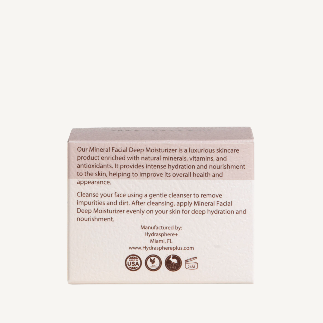 El uso regular de Mineral Facial Deep Moisturizer le ayudará a restaurar el equilibrio natural de hidratación de su piel, dejándola suave, tersa y rejuvenecida. Experimente lo último en lujo para el cuidado de la piel con nuestra Hidratante Mineral Facial Profunda y disfrute de los beneficios transformadores que aporta a su régimen de belleza diario.